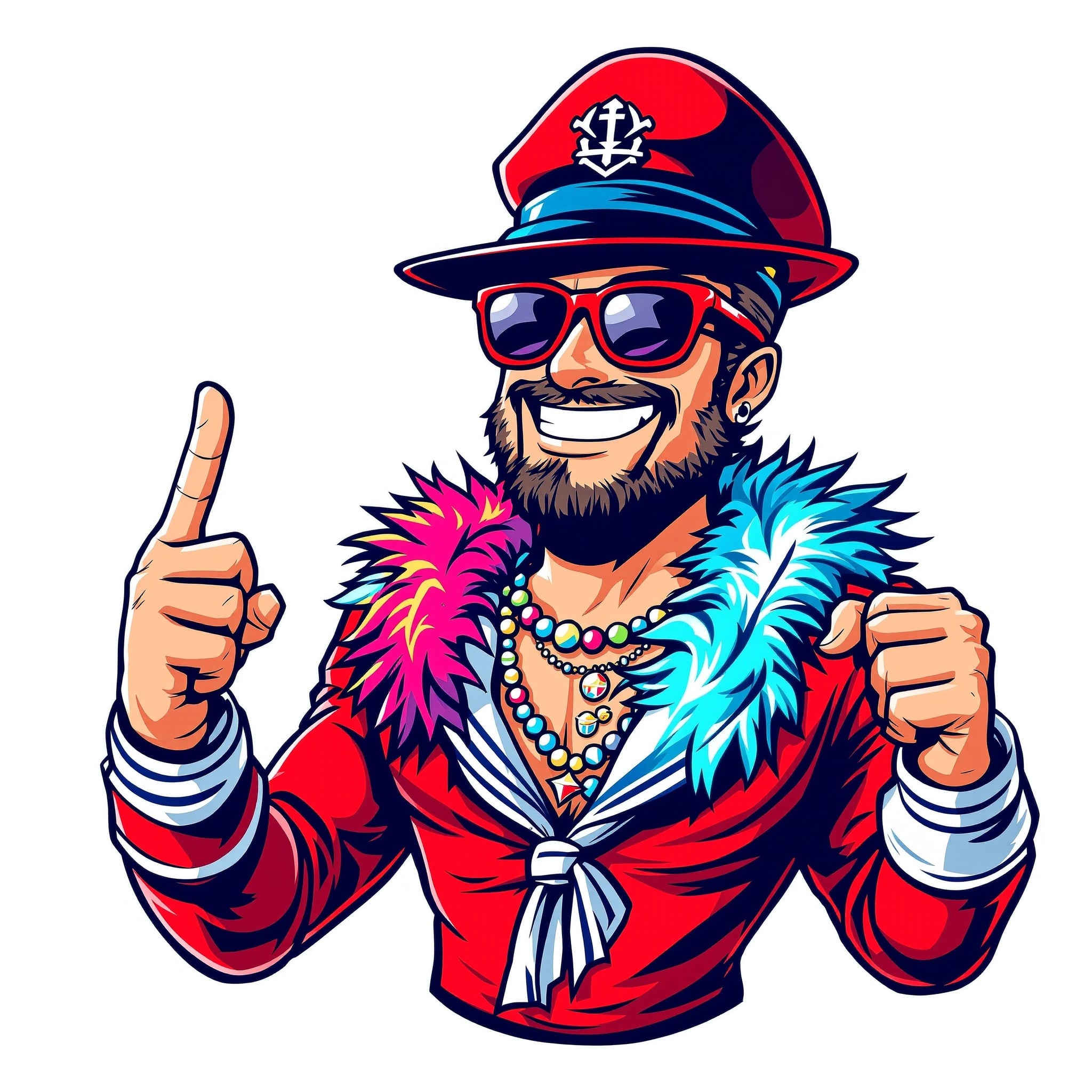 Captain Red lives for the cruise life — from Scarlet Night glam to poolside vibes in Bimini. He's here to make sure your crew shows up in style with the best RED swag on the ship. Fabulous, fun, and always party-ready! 🎉